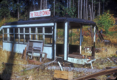 This great photo recently posted by Patrick Selby is one of the reasons I finally came to embrace Facebook. You might think, at first glance, that the derelict is the carcass of a bus but, no, it’s one of Victoria’s fabled streetcars that was later converted to a roadside cafe in Langford then gutted.