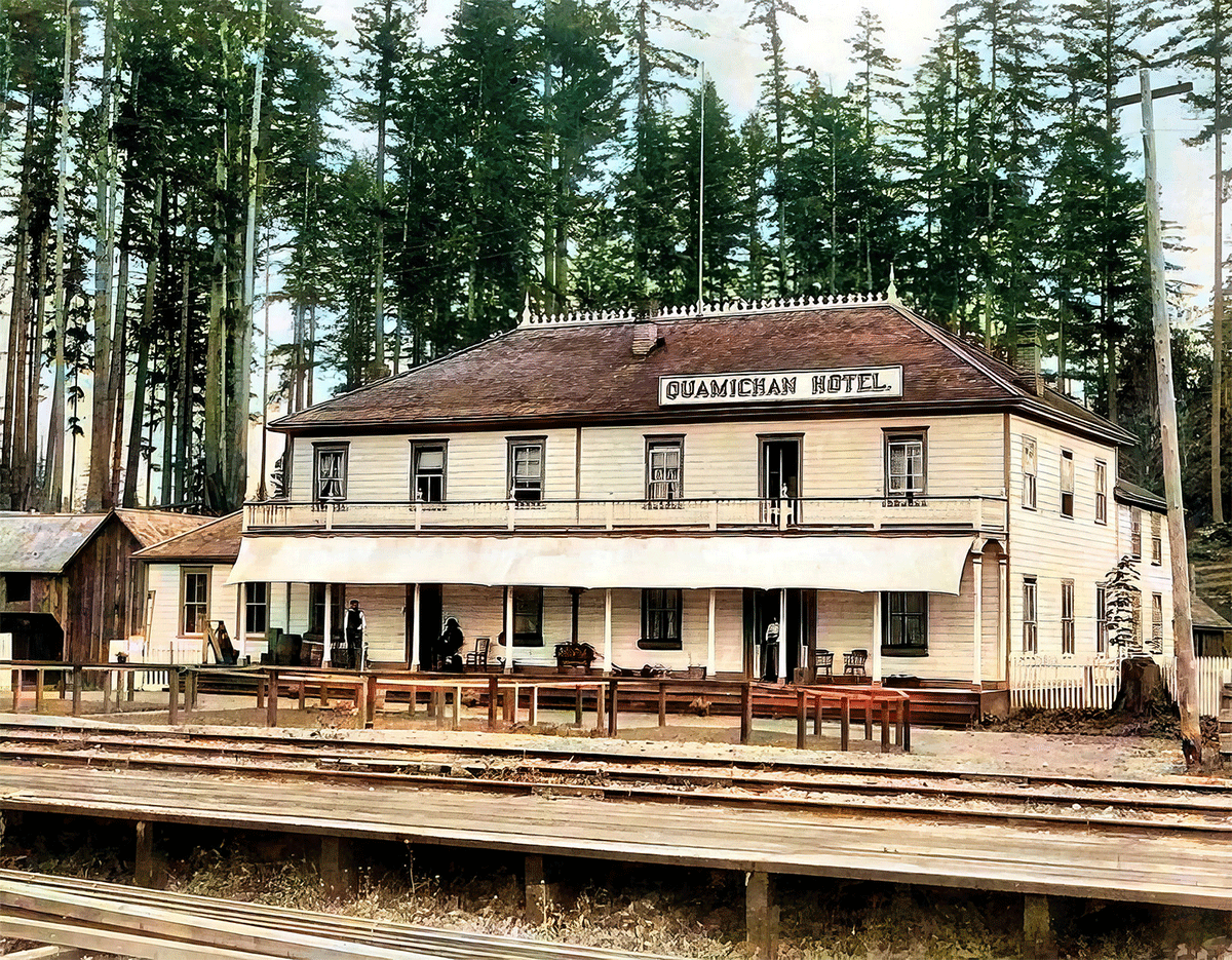The handsome Quamichan Hotel on Duncan Ave., Duncan, as it likely looked in 1895. It and the Tzouhalem across the railway tracks were the city’s leading hotels in the long ago. Duncan also had the Alderlea Hotel, known as the “loggers’ and miners’ resort”—a horse of a totally different colour! —Nigel Robertson
