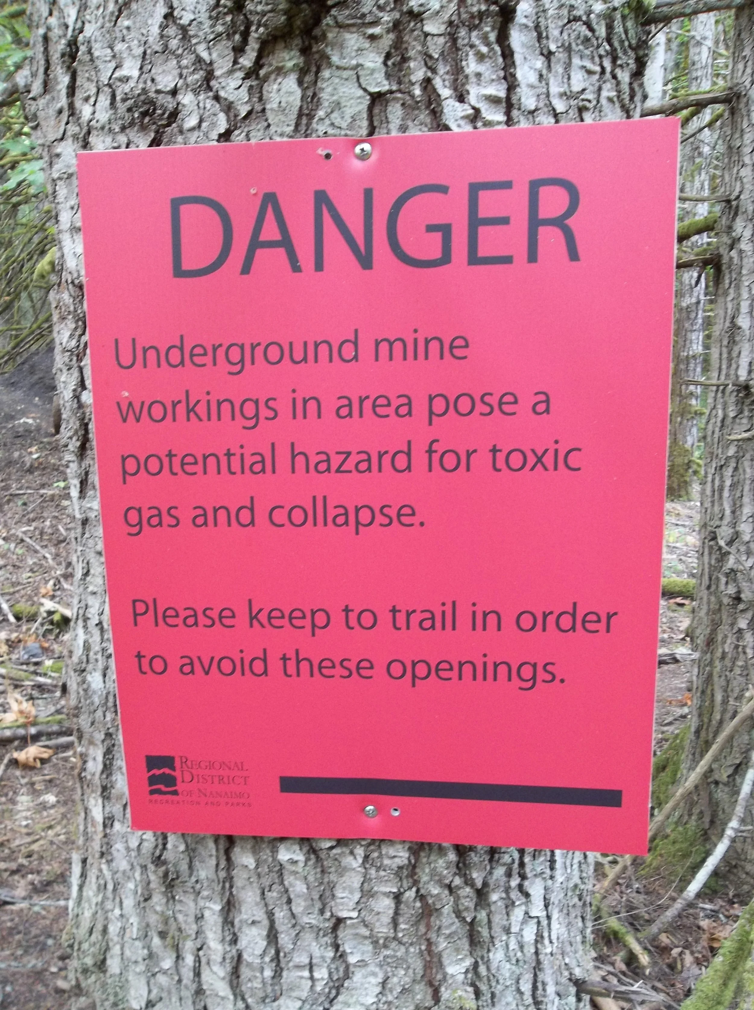 Hikers in South Wellington are advised by warning signs of the potential dangers of a collapsing coal mine. —Author’s collection