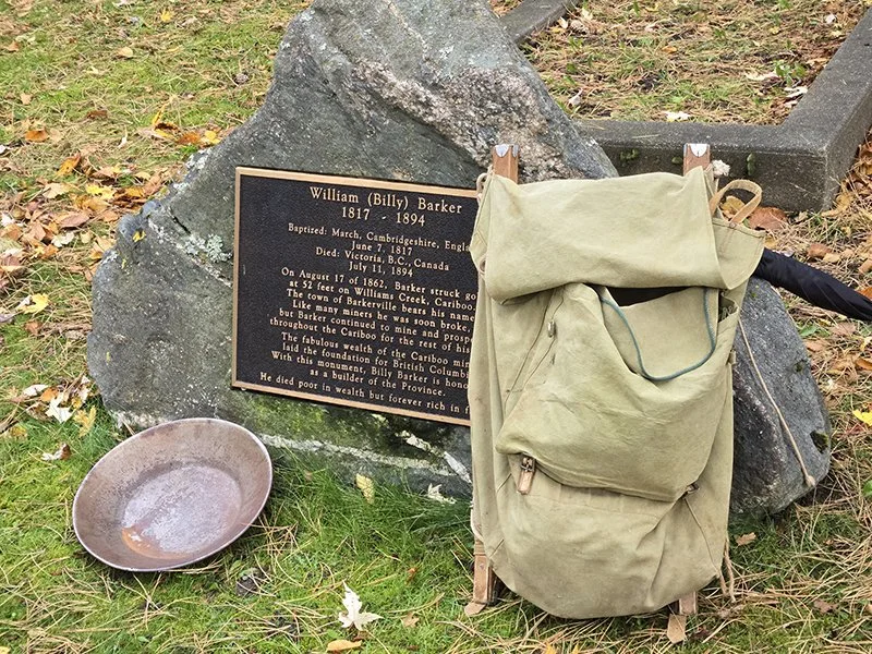 To set the scene for a Cariboo ghost tale, Billy Barker’s headstone was decorated with gold pan and packsack.