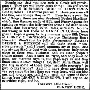 Ruling out that young Ernest was working on commission, it becomes evident that the letter is part of a crafty ad campaign by LINSEY & DICKSON’S, in which Ernest asks Santa for “sensible presents”, basically clothes, from the shop to give to his friends. His letter is even accompanied by a response from ‘Santa’ himself.