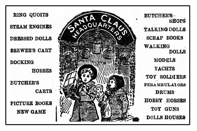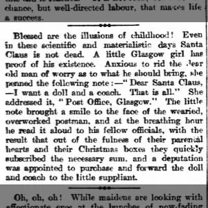 Next, a lovely tale was published in the North-Eastern Daily Gazette (Middlesbrough) in December 1896. Unsure of where to deliver her correspondence, a little Glasgow girl sent her letter to Santa to the ‘Post Office, Glasgow’ hoping it would find its way to Saint Nick.