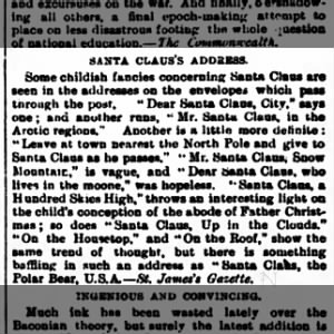 The article shares some of the addresses children used on the envelopes of their letters to Santa. Despite the scathing tone of the article, pouring scorn over the attempts to locate Santa, we can’t help but revel in the childhood innocence demonstrated in the addresses recorded: