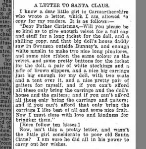 Christmas is the time for giving, and in this spirit, the Cardiff-based Western Mail ran a ‘Santa Claus Fund,’ giving needy boys and girls in the Cardiff area a day of entertainment, feasting, and gifts. Readers were invited to donate funds and items for the day, and the paper documents the many generous donations. Some even made their contributions via a letter to Santa, like M. Ayers in 1895: