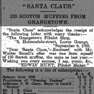 While Edwin Hunt, pikelet maker [a small, round, thick pancake like a crumpet, baked on a griddle at Christmas], promised Santa 100 Scotch muffins for the event.