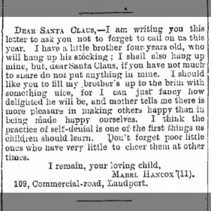 She also asks Santa not to forget “poor little ones who have very little to cheer them at other times.” We hope the kind-hearted Mabel woke to a much-deserved Christmas stocking on Christmas Day.