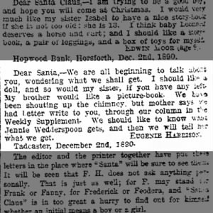 Eugene Harrison sent his letter to Santa via the Weekly Supplement of the Leeds Mercury in December 1890 after his initial efforts to contact the Big Man were stifled. After outlining his requests (a doll each for Eugene and his sister and a picture book for his brother), he informs Santa, “We have been shouting up the chimney, but mother says we had better write to you, through your column in the Weekly Supplement.”