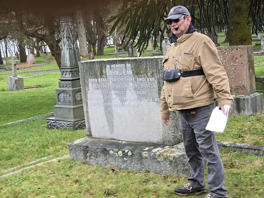 One of the Old Cemeteries Society’s original tour leaders, Glenn Perlstrom Jr., tells another fascinating tale of “Twisted History” at the Ross Bay Cemetery, last March. All these years and tours later, he has never run out of material!