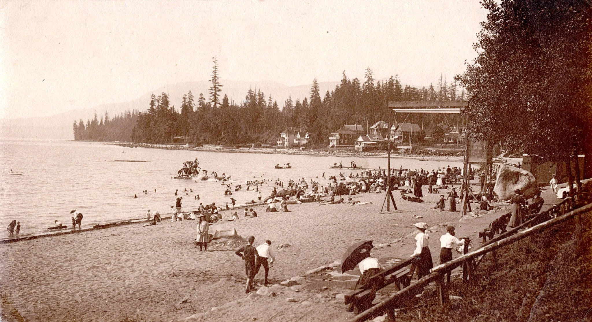 “For about four years now I’ve noticed a particular fir tree in old photos of English Bay looking toward Stanley Park. In early photos where the beach is photographed toward the park, in every image there’s this extremely tall fir in the distance. I’d read in Al Carder’s book and from Micah about a giant fir near the Barclay Street entrance of Stanley Park that stood 325 ft and was removed for safety reasons and because it was dead in 1916.