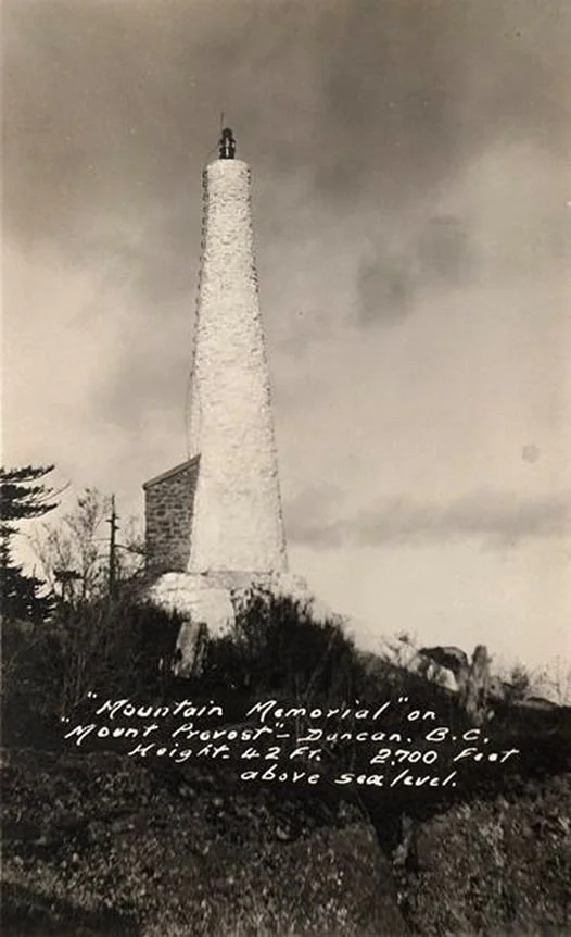 The ca 1929 lighthouse memorial to Cowichan’s war dead on Mount Prevost. —Cowichan Valley Museum/Archives