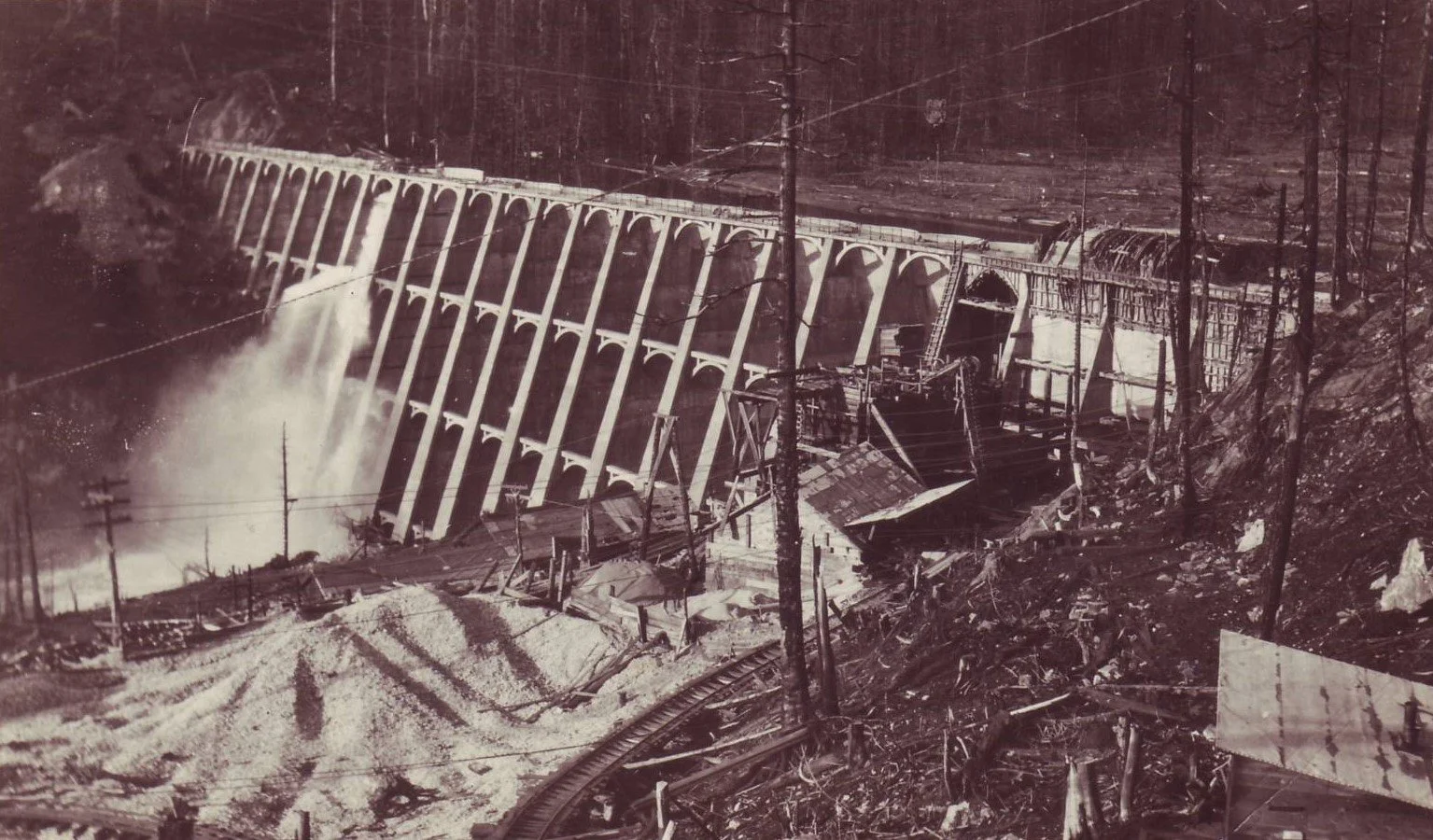 Once the surveyors had done their work, three trunk line sewers were laid, then streets of 2-by-12 planking, so laid out as to follow the contour of the land. In the meantime, more bunkhouses and an enlarged mess hall had been completed, down on what was known as the Flats, work proceeding rapidly on the railway right-of-way and on No. 1 powerhouse and dam.