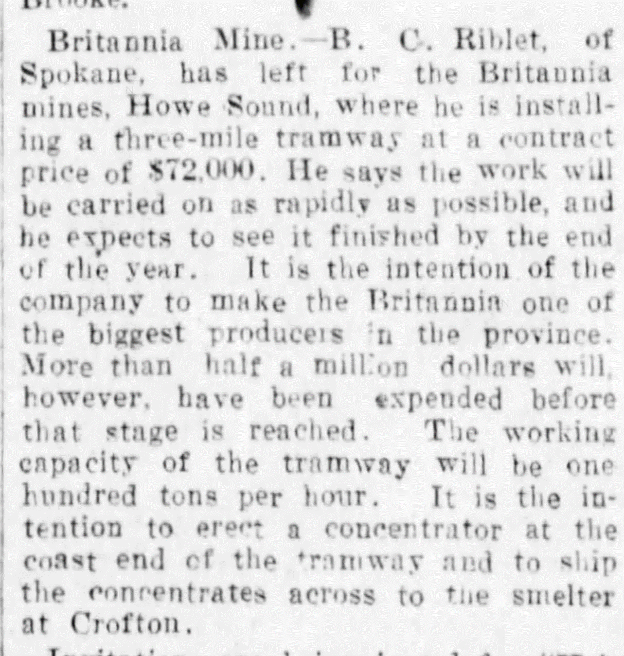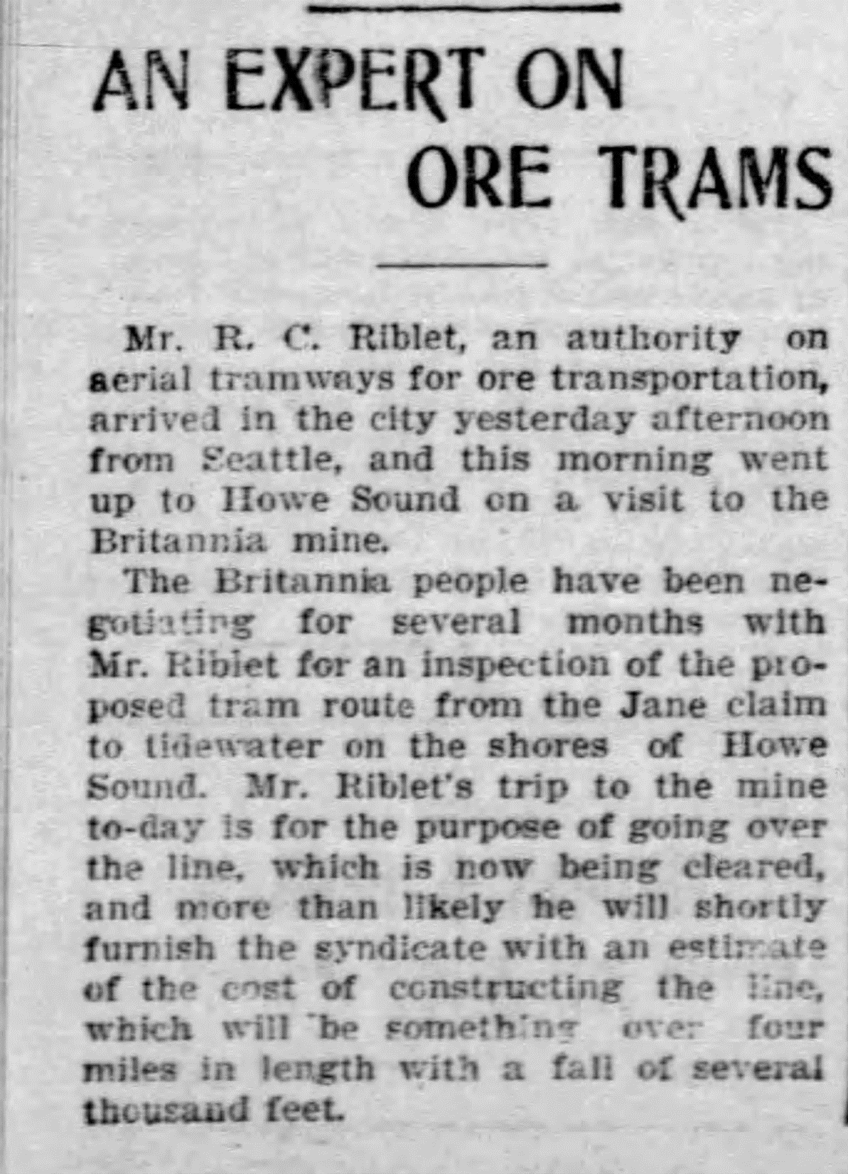 “Messrs. Ribelt and Painter, both of Nelson, B.C., have been in Duncans in connection with the aerial tramway which it is proposed to build from the Tyee mine to a point near Somenos on the E.N. [sic] railway.”