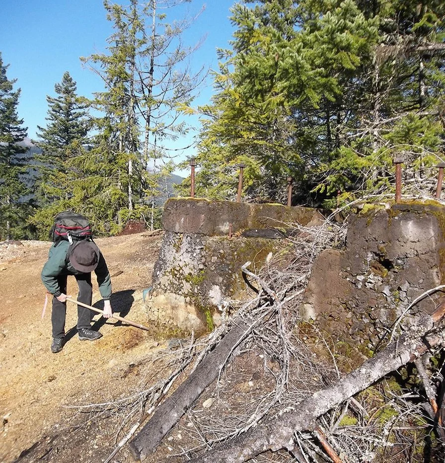 ‘Last man standing’: the concrete foundation of the Riblet tramway beside the ore dump of the Tyee Mine. —Author Photo