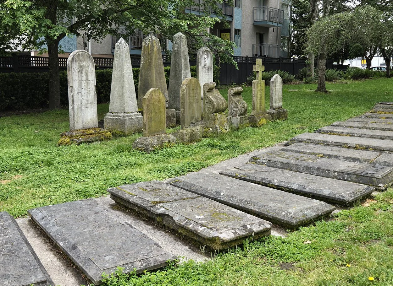 This is the old Quadra Street Cemetery, 1855-1873, also known today as Pioneer Square where’ you’re free to walk on the 1300 graves and to picnic on the grass because the City, in its wisdom many years ago, moved surviving headstones to along the back fence. This, long before cemeteries became the targets of vandals.