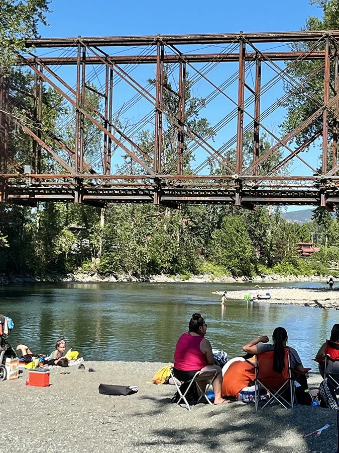 The bridge and the river are on land claimed by the Quwʼutsun Nation, but everyone can splash in the river, come summer.