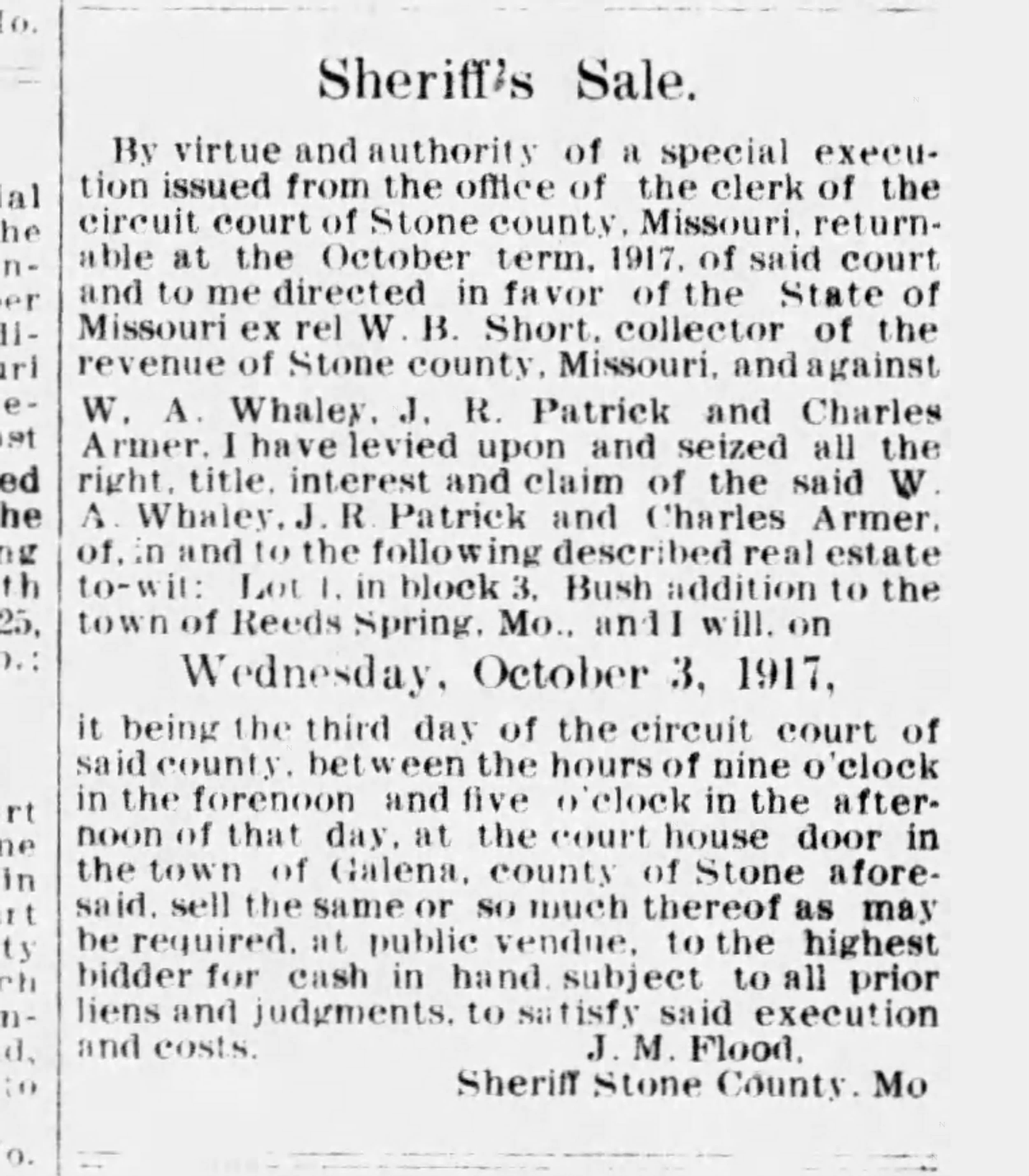 After making a fortune as a smuggler, Capt. W.A. Whaley lost it all. —Stone County News Oracle, Sept. 12, 1917