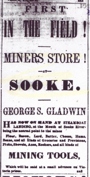 For many Victoria merchants the gold strike on the Leech River was a godsend. George S. Gladwin, as shown in this advertisement in the British Colonist, claimed to be the “first in the field!”.