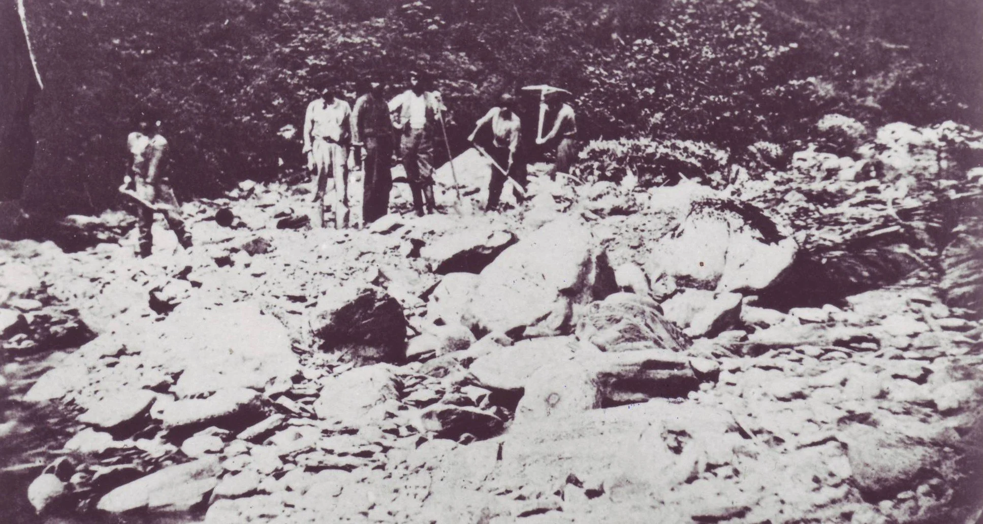 Gold mining, particularly on the Leech River, wasn’t for the indolent as this barren rockscape identified as the California claim clearly shows. Pans and rockers were used but, it being too late in the season for fluming, some of the best paying deposits were found by crevicing—the difficult job of extracting dust and nuggets from rock fissures, using whatever tools were available, even spoons. —B.C. Archives