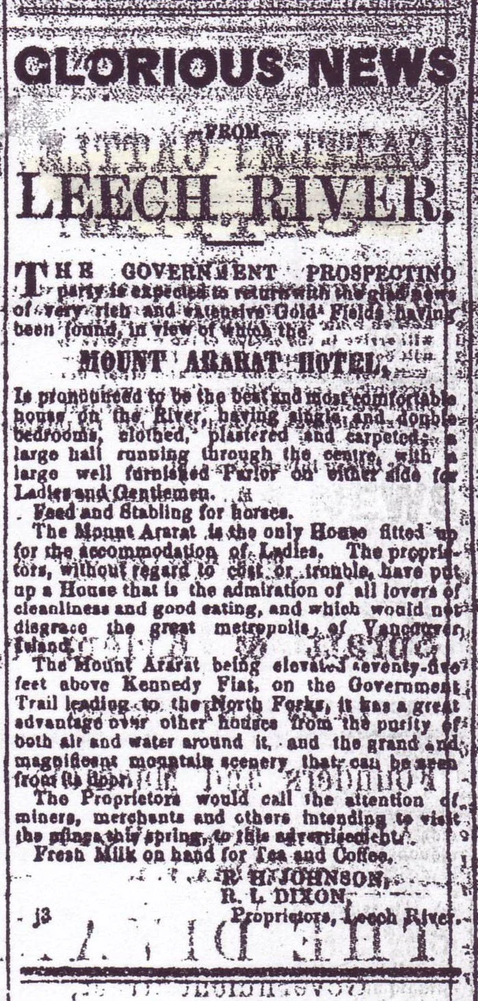June 5 – Visitors declare Messrs. Johnson & Dixon’s Mount Arrarat Hotel to be “as clean and comfortable a house of accommodation as can be desired... The proprietors offer special inducements to the travelling public to patronize their establishment.”