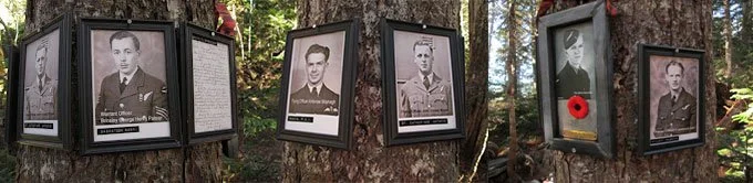 This crash site west of Cowichan Lake, with its wreckage and common grave, attracts many visitors. Several years ago, I attended an on-site Remembrance Day ceremony with members of the Mesachie Lake Fire Department and RCAF from Comox airbase. A low overcast day with a light mist was so in keeping with the solemness of the event.