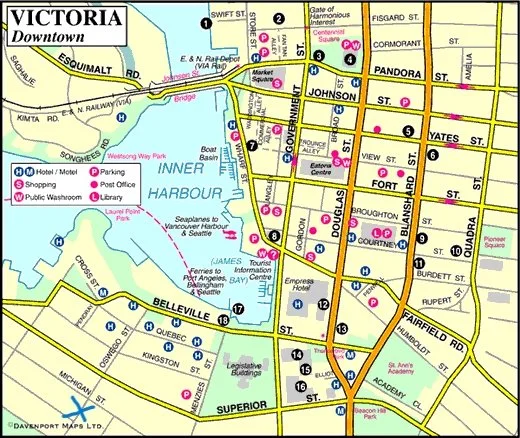 The Capt. Moffatt residence was at the corner of Oswego and Michigan Streets (see X at bottom left), four blocks from the Inner Harbour. —Yahoo.com