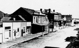 The Victoria Theatre, later the Theatre Royal, is the unimposing building mid-photo. By all accounts, it was much more luxurious inside. —BC Archives