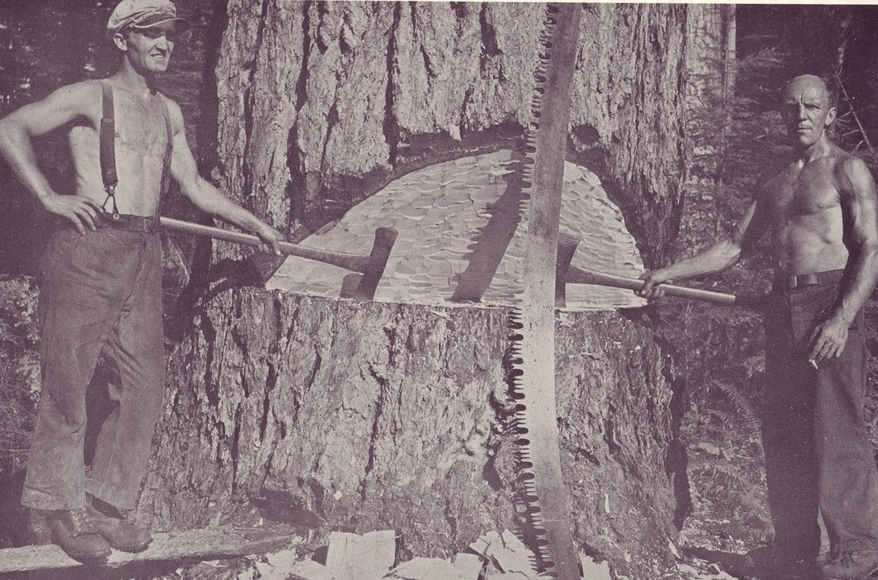 Mike King’s luck was with him this day, thanks to a crew of hand loggers like the two shown here. --Author’s Collection