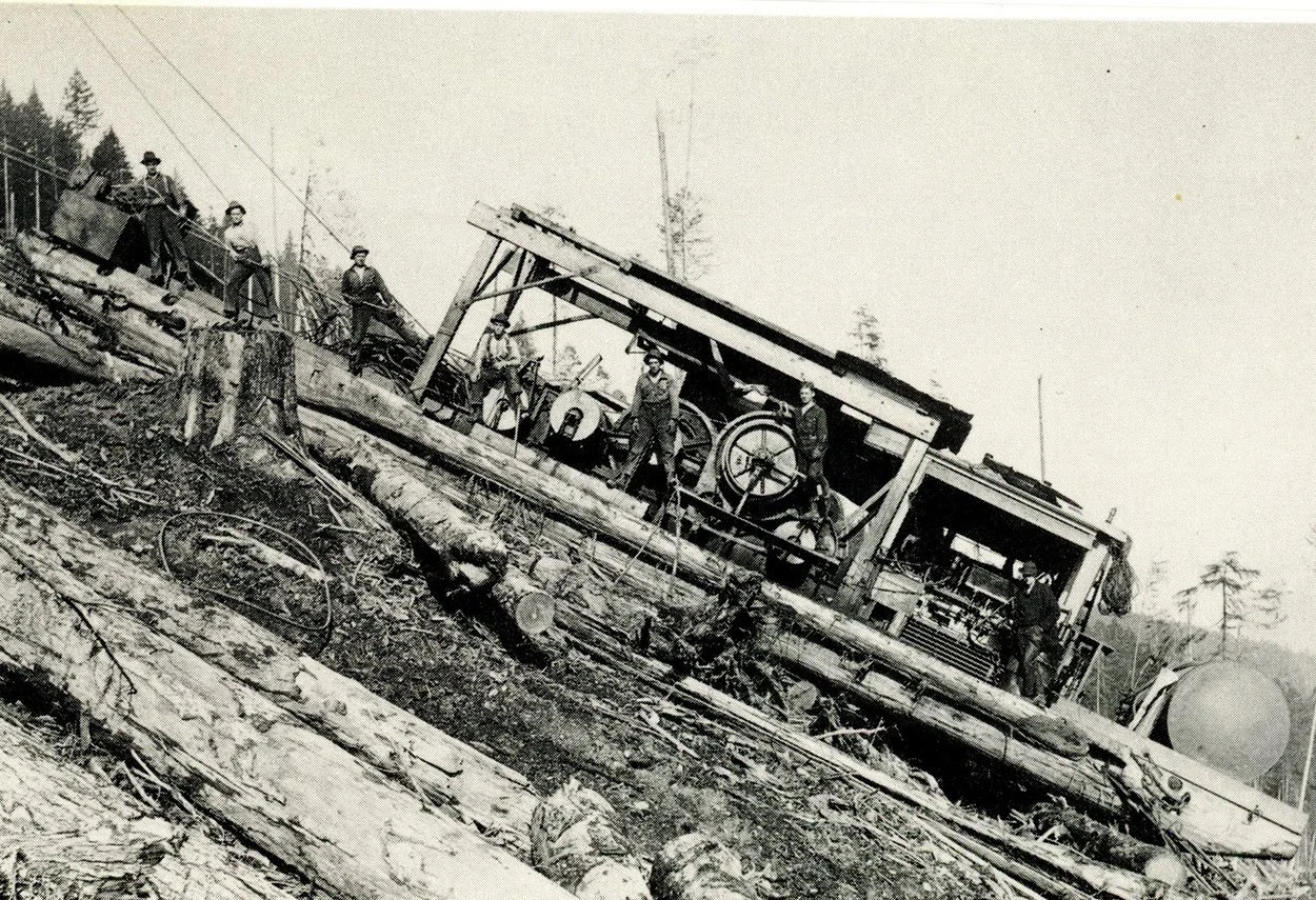 A Camp 6 crew moves an Industrial Timber Mills Co. cold-deck machine at Caycuse in 1936. —Author’s Collection