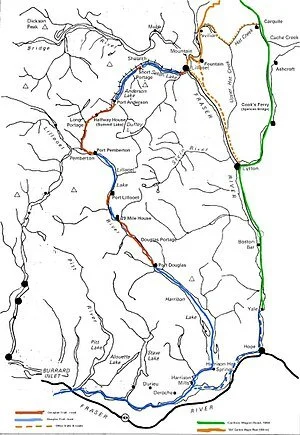 But, upon coming to the Cariboo wagon road, then under construction, the trail pinched out.