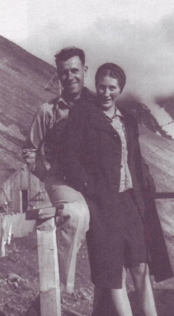 Within the year of our marriage we moved to Bralorne and then on to the Red Rose mine at Hazelton. It was quite an experience for a girl of eighteen. We lived in tents with a bed made of fir boughs, about 10 inches long and stacked with the soft end up. The bed had to be remade when a sunny day came, which was very seldom.