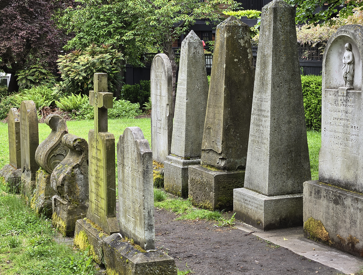 The Quadra Street Cemetery, aka Quadra Street Burying Ground, aka Pioneer Square as it looks today. Many of its headstones were clustered along the back fence by a cost-cutting city works department years ago and their original placements are unknown. Fortunately for Sophie Cameron, her sealed casket was exhumed and shipped home to Glengarry, Ontario. —Author’s photo