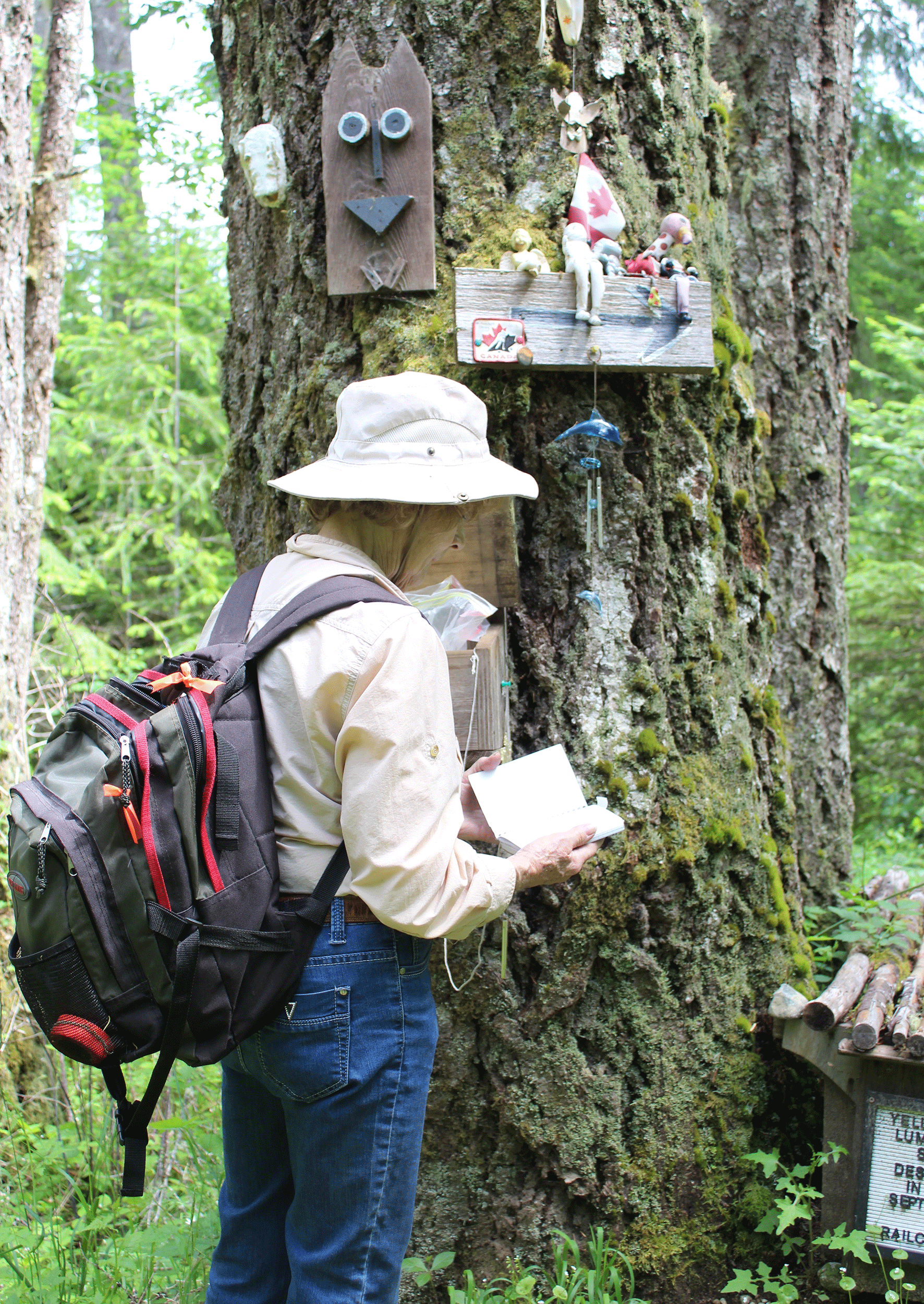 You’ll know when you arrive at Yellow Fir by this tree which has served as a geocache and has sprouted a motley collection of curios. Jennifer is reading photocopied pages of my book, Historic Hikes, Sites & Sights of the Cowichan Valley, that someone has posted for the benefit of passing hikers and cyclists.