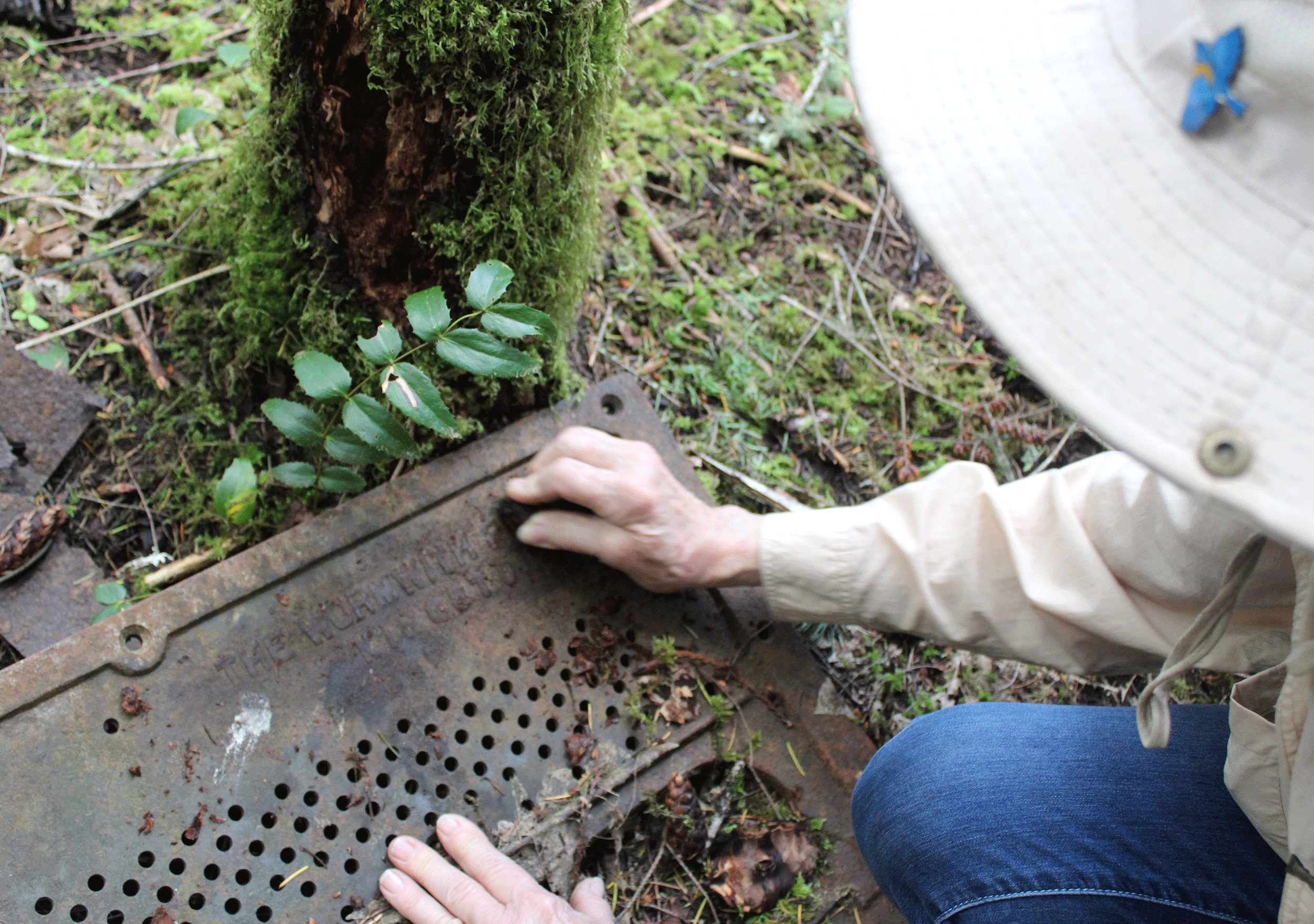 How do I know that’s the frame of a piano? Because the name of the manufacturer and place of origin is clearly cast. After rubbing away the dirt and surface rust with a piece of bark, Jennifer is able to read: