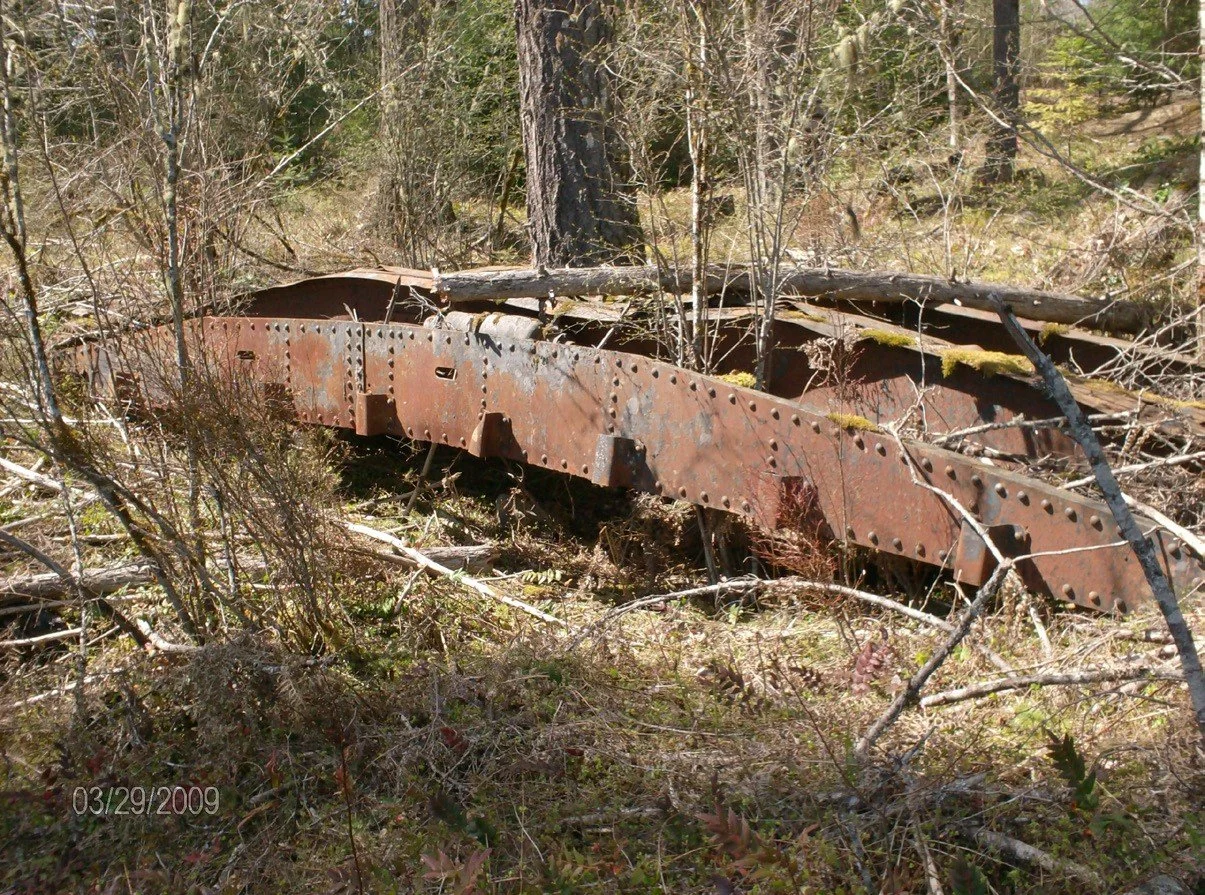 One was fully loaded and one partly loaded with more then one million feet of lumber valued at more than $22,000. The skeletons of the two flat cars are there today, with large trees growing through them, as are pulley wheels and other bits of scrap metal from the sawmill. Graphic evidence of the fire’s heat are the standard gauge steel rails from the siding that linked to the E&N that are twisted like pretzels.