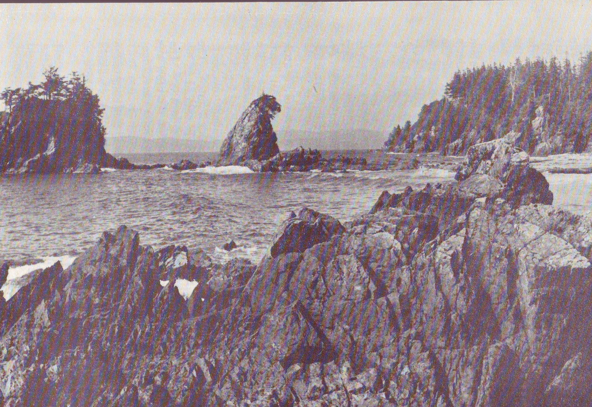 Typically rugged B.C. shoreline on a calm day. Now picture these jagged rocks during a raging gale with 50-foot-high waves (the height of a four-storey building) crashing ashore. —BC Government photo