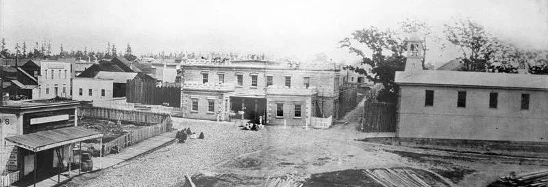 The Bastion Square Police Barracks, centre, witnessed human drama of all kinds, including William and Amelia’s jousts with the law. —BC Archives