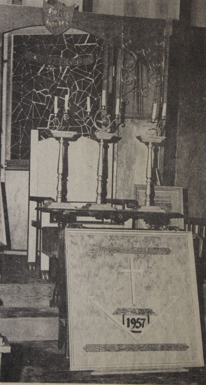 “Short range hymns and carols can be played on the bells. The altar, two small chapels, the communion rail, all are built. The pulpit was donated by Mr. Hubert Cashman of Victoria. The seating capacity is about 200.”